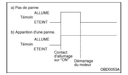 2) Après avoir démarré le moteur, le témoin d'anomalie s'éteint. Dans le cas contraire, le système de commande de moteur ou le système de commande d'émission mal fonctionne.