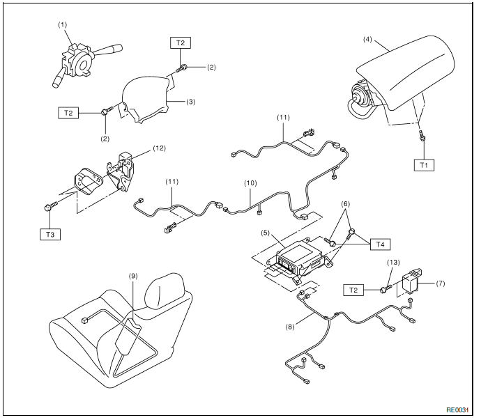 - Si les détecteurs, le module de coussin gonflable, la centrale de commande de coussin gonflable, le prétendeur et le faisceau sont déformés ou endommagés, remplacez-les par des pièces d'origine neuves.