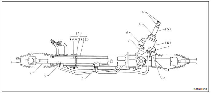 1) Si le point de fuite est autre que les points a, b, c ou d, procédez à la vérification étape 5 dans "Procédure de contrôle des fuites d'huile et pièces de rechange" avant de déposer le boîtier de direction du véhicule. <Voir "Procédure de contrôle des fuites d'huile et pièces de rechange".> Si vous déposez le boîtier de direction sans avoir repéré le point de fuite, il sera nécessaire de le remonter afin de localiser la fuite.