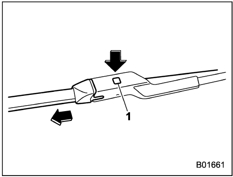 2. Tenez le raccord de balai d’essuieglace à la main, appuyez sur le bouton de verrouillage pour libérer le verrou, puis sortez l’ensemble balais d’essuie-glace.