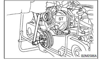 2) Déposez le boulon de poulie de vilebrequin. Utilisez l'outil spécial ST pour bloquer le vilebrequin.